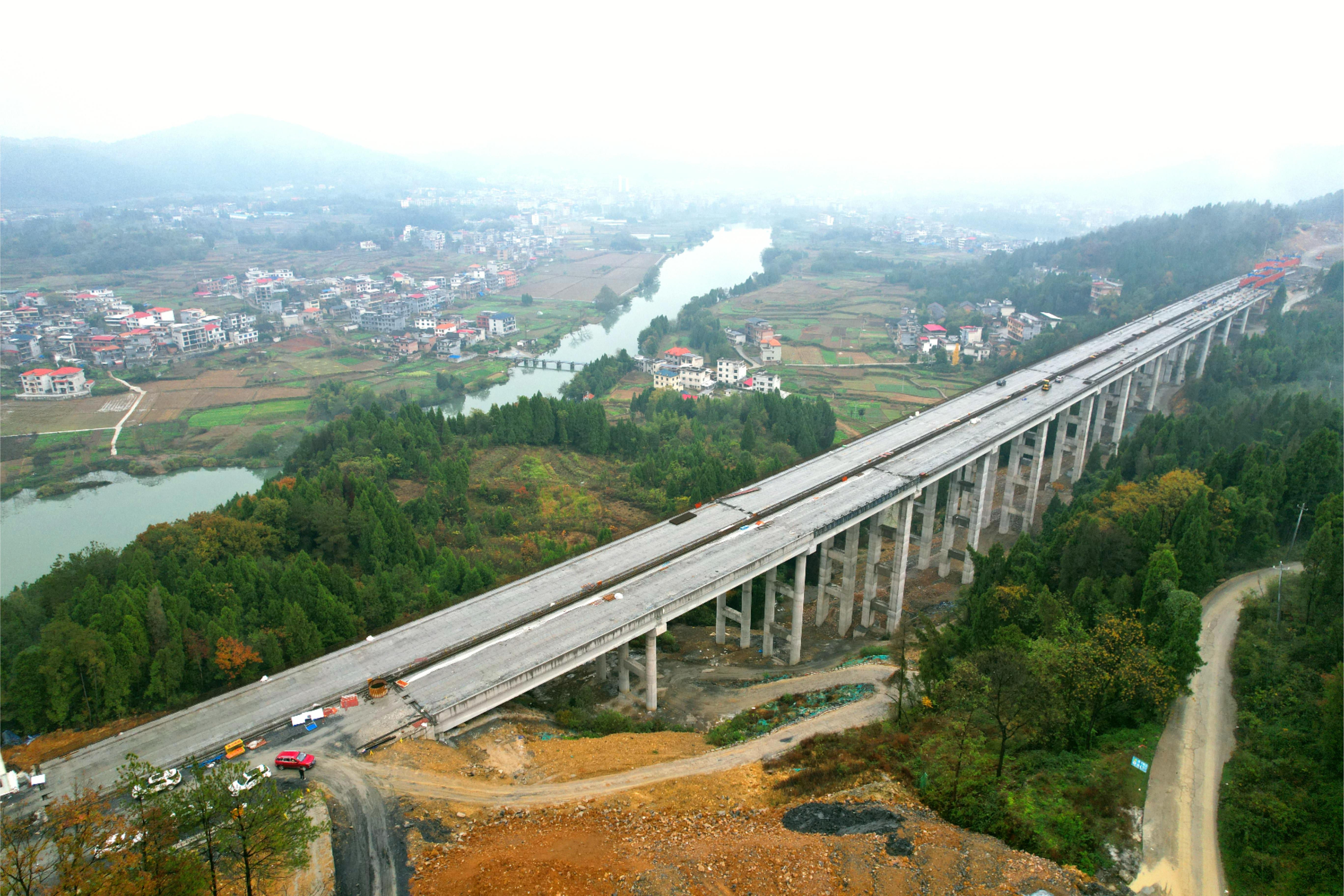 G59新新高速項目全長21.324千米,全線共25座橋梁,其中特大橋1座,天橋2座,互通式立交橋1座,大中橋21座。