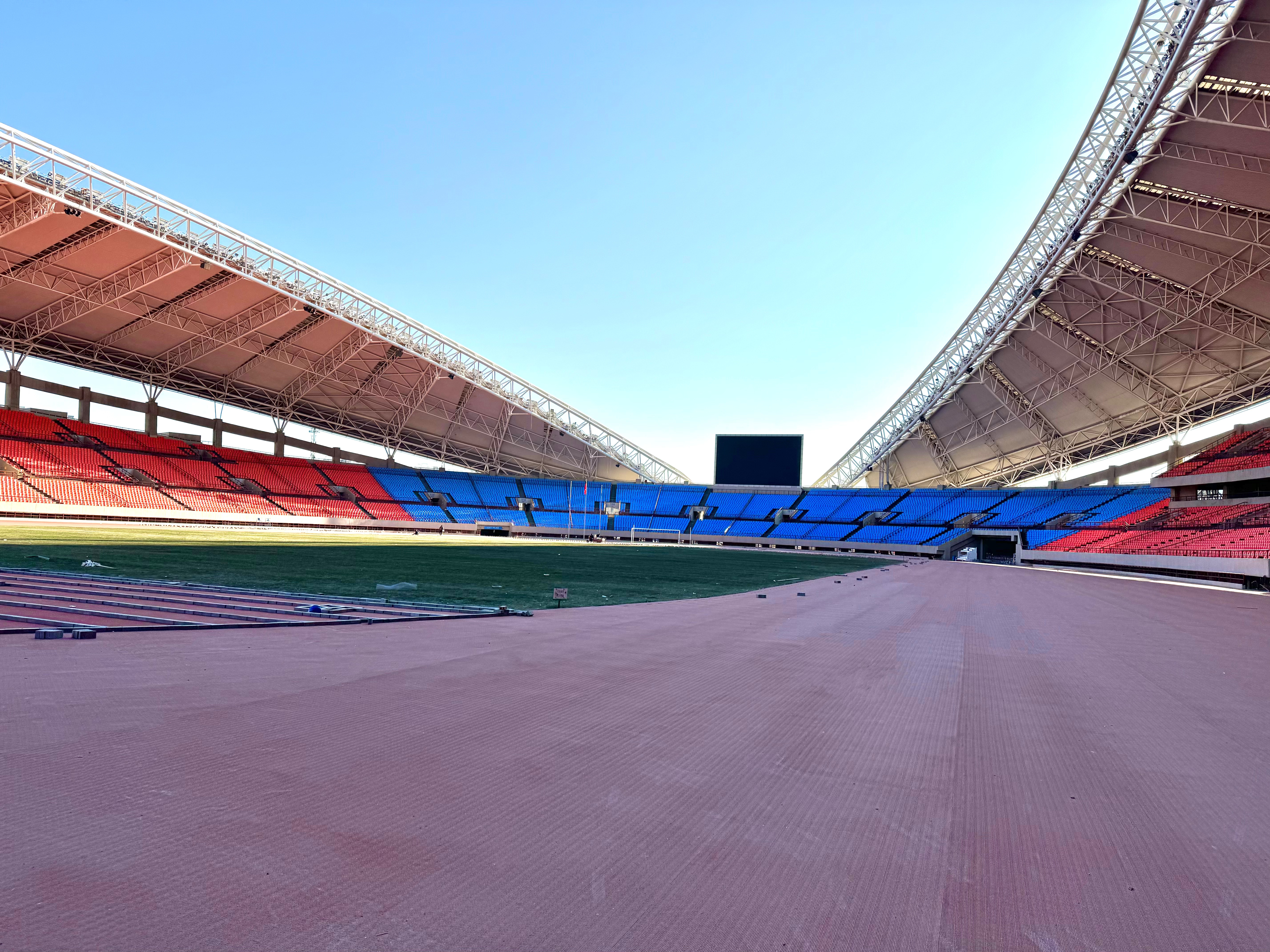 該項(xiàng)目地處建設(shè)路南側(cè)、建華路西側(cè)、奧林匹克大街北側(cè),是第十一屆中俄蒙國際青少年運(yùn)動(dòng)會(huì)及 2026年內(nèi)蒙古自治區(qū)第十六屆運(yùn)動(dòng)會(huì)的主場館。此次完工的橡膠跑道為一類A級(jí)標(biāo)準(zhǔn),需嚴(yán)格遵循《田徑競賽與技術(shù)規(guī)則》要求,各項(xiàng)物理性能參數(shù)均達(dá)國家級(jí)賽事標(biāo)準(zhǔn)。施工材料均選用經(jīng)中國田徑協(xié)會(huì)審定、且具備國內(nèi)外大型賽事應(yīng)用實(shí)績的知名品牌,完工后將由國家體育總局下屬具備CMA/CNAS認(rèn)證資質(zhì)的檢測機(jī)構(gòu)進(jìn)行專業(yè)驗(yàn)收。