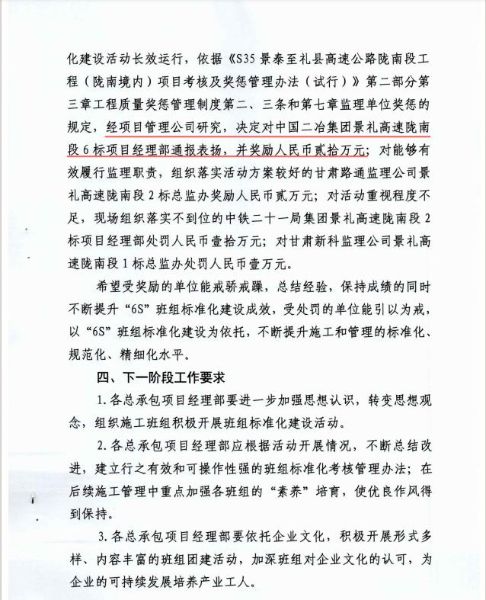 6月15日,景禮項目部在項目管理公司組織的6S班組標(biāo)準(zhǔn)化建設(shè)檢查中名列前茅,為此,項目管理公司對景禮六標(biāo)項目部進(jìn)行通報表揚(yáng),并給予獎勵20萬元。
