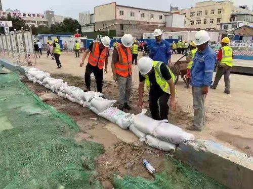 鶴壁開發(fā)區(qū)全域城市化建設(shè)項目部對施工現(xiàn)場生活區(qū)、辦公區(qū)和施工區(qū)進行檢查,確保排水系統(tǒng)通暢。由于施工現(xiàn)場107國道積水嚴重,為有效防范積水倒灌在建項目基坑工程,項目部準備了必備的排水機具、雨衣雨靴、編織袋和救生衣等防汛物資,組織全體管理人員在路基處設(shè)置排水溝,組織人力、物力和施工機械全力排除基坑中的積水。同時,持續(xù)24小時連續(xù)作業(yè),用沙袋在國道處搭筑起防洪墻,確保在建工程安全度汛。
