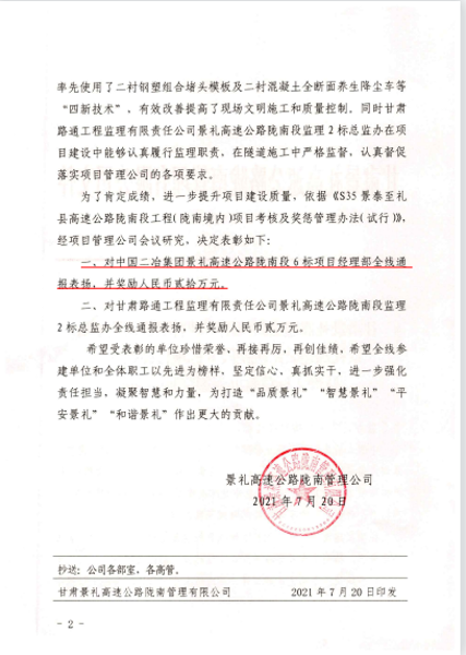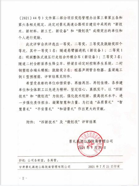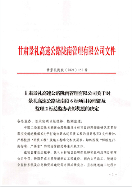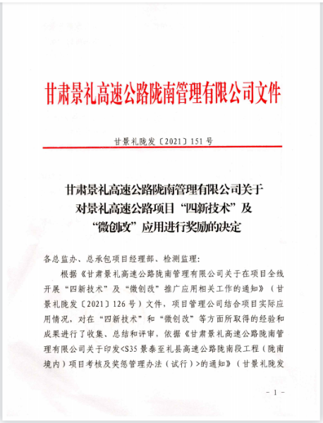 近日,甘肅分公司景禮項(xiàng)目部在甘肅景禮高速公路隴南管理有限公司組織的“四新技術(shù)”、“微創(chuàng)改”推廣應(yīng)用、“品質(zhì)工程”及施工標(biāo)準(zhǔn)化建設(shè)等檢查評(píng)比中名列前茅,項(xiàng)目管理公司對(duì)景禮項(xiàng)目部進(jìn)行通報(bào)表?yè)P(yáng),并給予獎(jiǎng)勵(lì)40萬元。