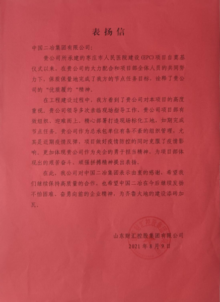 8月9日,中國二冶收到業(yè)主單位山東財匯控股集團有限公司的表揚信,來信對中國二冶集團科學(xué)組織、精心部署表示感謝,對棗莊人民醫(yī)院建設(shè)(EPC)項目當前的各項工作進展情況給予了高度贊揚。