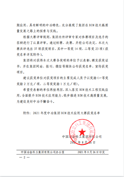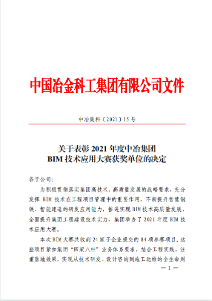 8月26日,中冶集團(tuán)〔2021〕5號文件《關(guān)于表彰2021年度中冶集團(tuán)BIM技術(shù)應(yīng)用大賽獲獎單位的決定》揭曉獲獎名單,中國二冶包頭市實訓(xùn)基地項目《包頭高技能人才公共實訓(xùn)基地項目BIM技術(shù)應(yīng)用》在本次大賽中榮獲“2021年度中冶集團(tuán)BIM技術(shù)應(yīng)用大賽二等獎”。