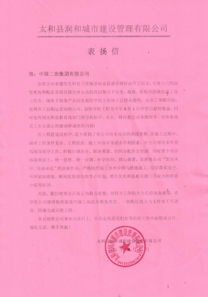 信中太和縣潤(rùn)和城市建設(shè)管理有限公司對(duì)中國二冶在各方面的工作支持深表感謝,希望中國二冶繼續(xù)保持優(yōu)良的施工風(fēng)范及服務(wù)理念,一如既往地大力支持該工程建設(shè),圓滿完成后續(xù)工程。并表示愿與中國二冶集團(tuán)有限公司在今后的工作中能精誠合作,共鑄輝煌!