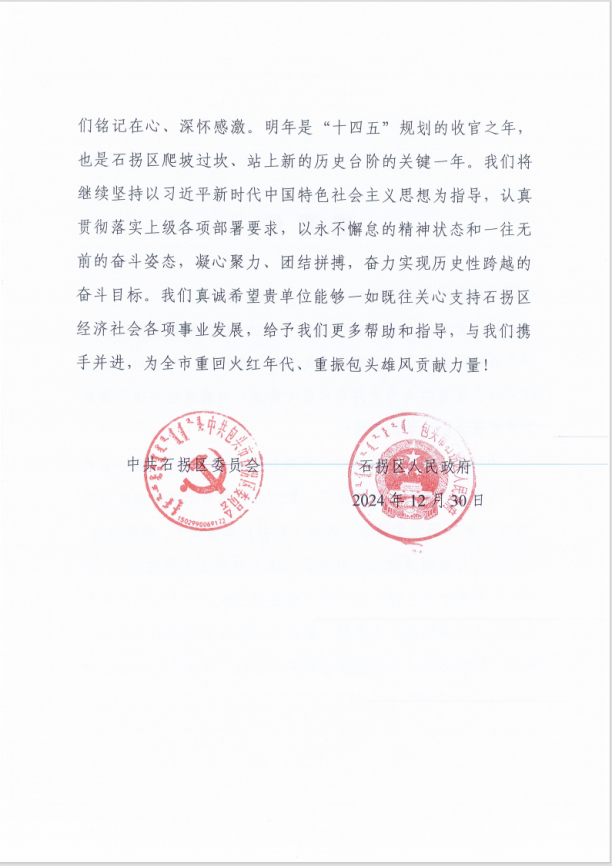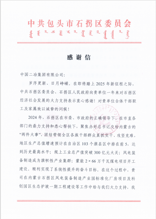 信中指出,2024年,石拐區(qū)在市委、市政府的正確領(lǐng)導(dǎo)下,在市直各部門的鼎力支持和悉心幫扶下,聚焦辦好習(xí)近平總書記交給內(nèi)蒙古的“兩件大事”,團(tuán)結(jié)帶領(lǐng)全區(qū)各族干部群眾真抓實(shí)干、攻堅克難,地區(qū)生產(chǎn)總值增速預(yù)計在自治區(qū)103個旗縣區(qū)中排在前5,達(dá)到歷史最高水平;規(guī)上工業(yè)總產(chǎn)值突破300億元大關(guān);風(fēng)電裝備制造成為旗幟性產(chǎn)業(yè)集群;蒙能2×66萬千瓦煤電項(xiàng)目開工建設(shè)。順利實(shí)現(xiàn)了系統(tǒng)性提升的奮斗目標(biāo)。在這個過程中,中國二冶在內(nèi)蒙古石拐區(qū)風(fēng)電裝備制造產(chǎn)業(yè)園標(biāo)準(zhǔn)化廠房項(xiàng)目及科創(chuàng)園區(qū)生態(tài)護(hù)坡一期項(xiàng)目等工程建設(shè)中給予大力支持,我們銘記在心、深懷感激。明年是“十四五”規(guī)劃的收官之年,也是石拐區(qū)爬坡過坎、站上新的歷史臺階的關(guān)鍵一年。我們將繼續(xù)堅持以習(xí)近平新時代中國特色社會主義思想為指導(dǎo),認(rèn)真貫徹落實(shí)上級各項(xiàng)部署要求,以永不懈怠的精神狀態(tài)和一往無前的奮斗姿態(tài),凝心聚力、團(tuán)結(jié)拼搏,奮力實(shí)現(xiàn)歷史性跨越的奮斗目標(biāo)。