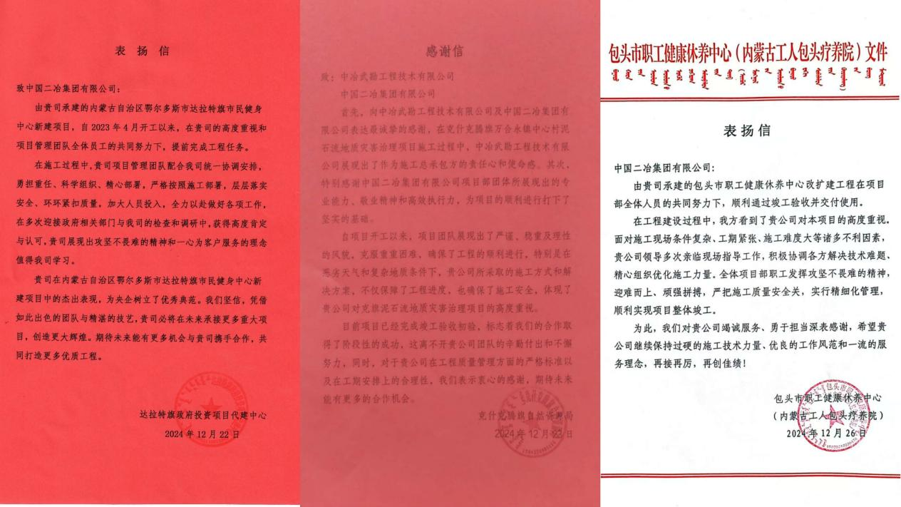 近日,中國二冶先后收到來自達(dá)拉特旗政府投資項(xiàng)目代建中心、克什克騰旗自然資源局以及包頭市職工健康休養(yǎng)中心的三封表揚(yáng)信。信中高度贊揚(yáng)了中國二冶在達(dá)旗健民中心項(xiàng)目、赤峰泥石流項(xiàng)目、包頭康養(yǎng)項(xiàng)目建設(shè)中展現(xiàn)出的卓越專業(yè)能力、嚴(yán)謹(jǐn)施工態(tài)度以及為地方經(jīng)濟(jì)社會(huì)發(fā)展作出的積極貢獻(xiàn)。