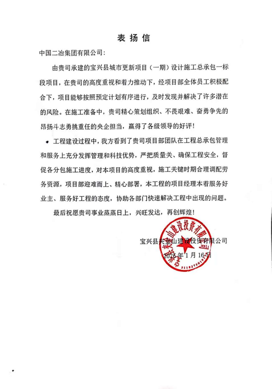 中國(guó)二冶收到建設(shè)單位表?yè)P(yáng)信