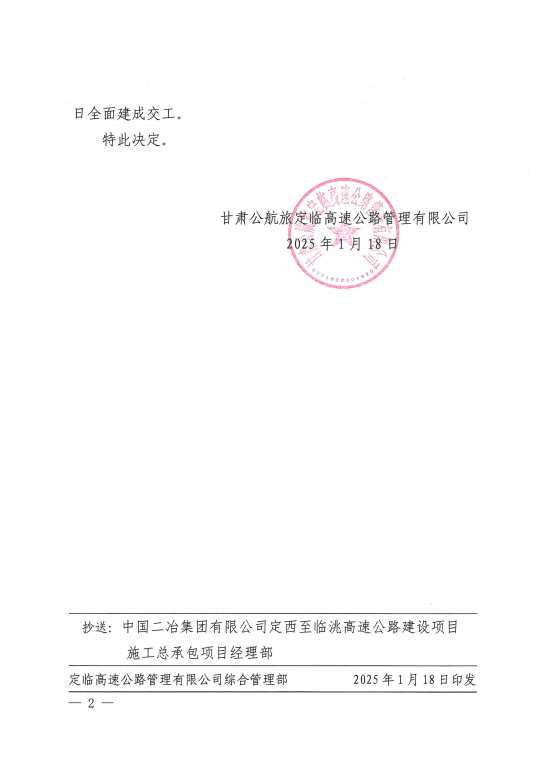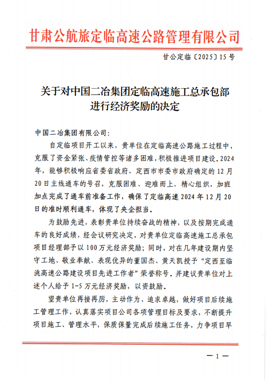 獎勵決定指出:自定臨項目開工以來,中國二冶集團(tuán)項目管理團(tuán)隊克服了資金緊張、疫情管控等諸多困難,積極推進(jìn)項目建設(shè)。2024年,能夠積極響應(yīng)省委省政府、定西市委市政府確定的12月20日主線通車的號召,克服困難、迎難而上、精心組織,加班加點(diǎn)完成了通車前準(zhǔn)備工作,確保了定臨高速在2024年12月20日準(zhǔn)時順利通車,體現(xiàn)了央企擔(dān)當(dāng)。