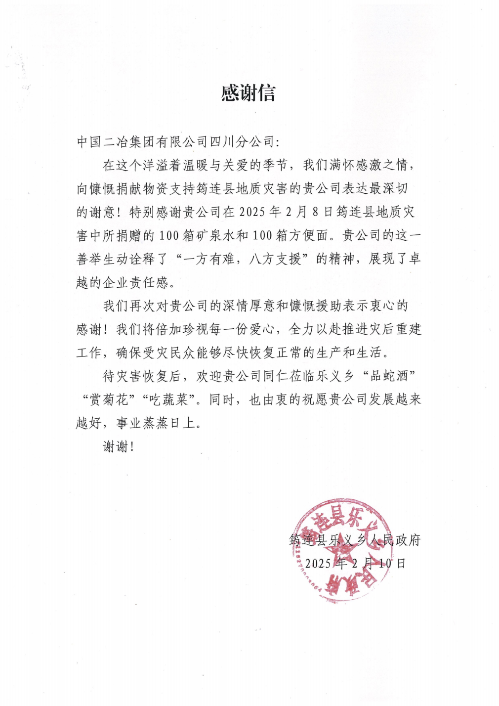 2月10日,中國(guó)二冶收到四川省宜賓市筠連縣樂義鄉(xiāng)人民政府感謝信,對(duì)中國(guó)二冶捐贈(zèng)物資支持宜賓市筠連縣山體滑坡?lián)岆U(xiǎn)救援工作表示敬意和感謝!