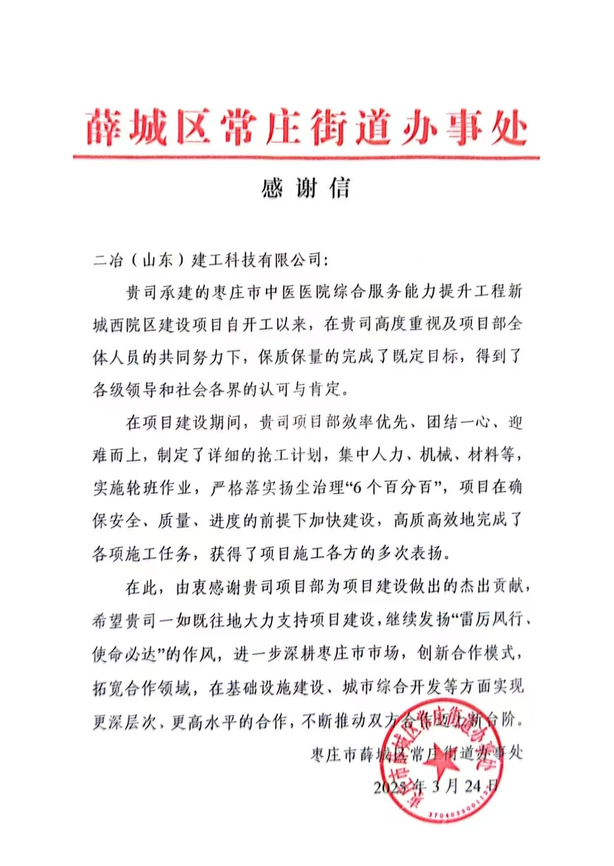 3月24日,中國二冶全資子公司二冶(山東)建工收到棗莊市薛城區(qū)常莊街道辦事處的感謝信。信中對棗莊中醫(yī)醫(yī)院項目自開工以來的卓越表現(xiàn)給予了極高的贊譽。