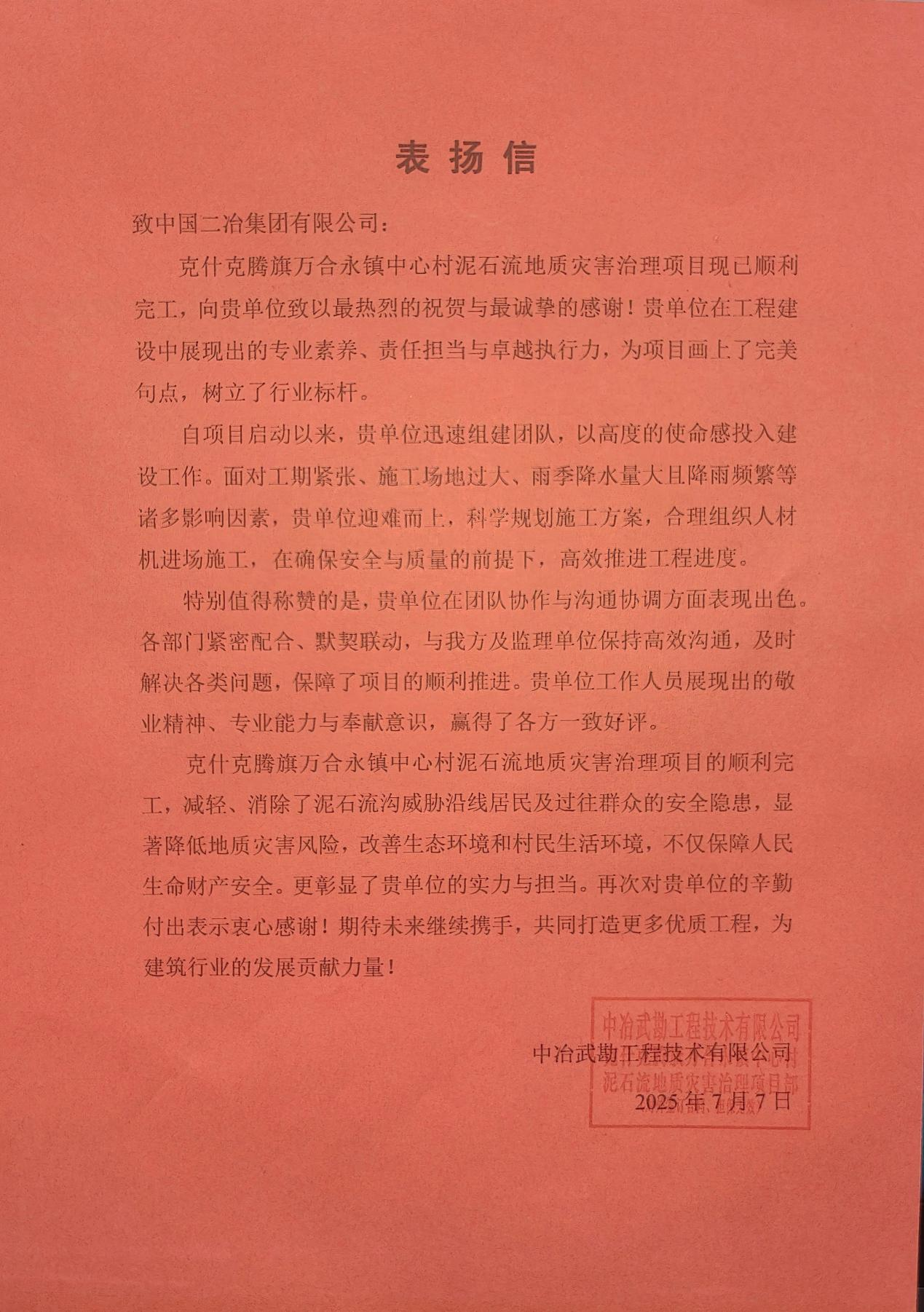 7月7日,中國二冶收到中冶武勘工程技術有限公司表揚信,表揚中國二冶在克什克騰旗萬合永鎮(zhèn)中心村泥石流地質災害治理項目建設中展現(xiàn)出的卓越專業(yè)素養(yǎng)、高度責任擔當和強大執(zhí)行力,為項目的順利完工和取得顯著成效作出了重要貢獻。
