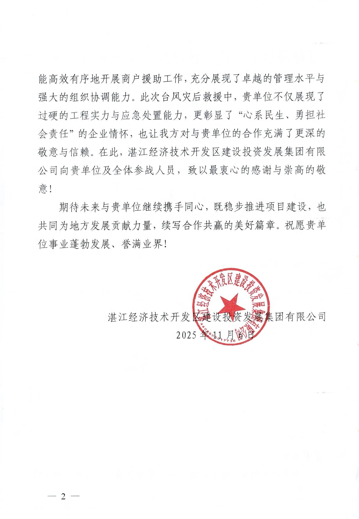 表?yè)P(yáng)信指出,臺(tái)風(fēng)“麥德姆”給龍海天景區(qū)及沿線商戶造成嚴(yán)重?fù)p失,災(zāi)后重建工作迫在眉睫。關(guān)鍵時(shí)刻,中國(guó)二冶主動(dòng)請(qǐng)纓、迅速響應(yīng),在風(fēng)雨未歇之際組建精干救援隊(duì)伍,調(diào)配挖掘機(jī)、裝載機(jī)等大型機(jī)械設(shè)備,投入充足人力全力參與搶險(xiǎn)。救援人員發(fā)揚(yáng)連續(xù)作戰(zhàn)的優(yōu)良作風(fēng),高效開展倒伏樹木清理、斷枝搬運(yùn)、道路疏通、淤泥清運(yùn)及受損設(shè)施修復(fù)等工作,作業(yè)規(guī)范、成效顯著。施工人員不顧疲憊與辛勞,耐心為商戶排憂解難,部分人員手磨破、衣服濕透仍毫無(wú)怨言,用實(shí)際行動(dòng)詮釋了“把商戶的事當(dāng)作自己的事”的責(zé)任擔(dān)當(dāng),讓受助商戶倍感溫暖。表?yè)P(yáng)信特別提到,中國(guó)二冶在承擔(dān)自身繁重施工任務(wù)的同時(shí),仍能高效有序推進(jìn)援助工作,充分展現(xiàn)了卓越的管理水平、強(qiáng)大的組織協(xié)調(diào)能力及過(guò)硬的應(yīng)急處置實(shí)力。
