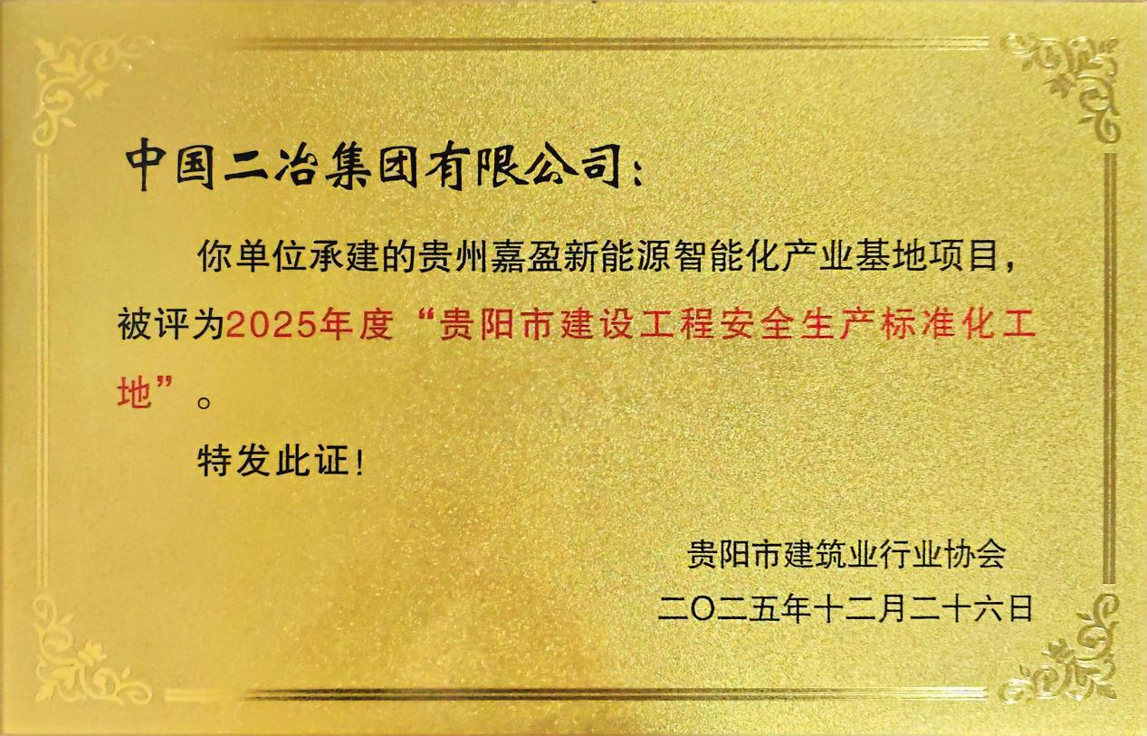 近日,中國二冶貴州嘉盈新能源智能化產(chǎn)業(yè)基地項目榮獲貴陽市建筑業(yè)行業(yè)協(xié)會頒發(fā)2025年度“貴陽市建設(shè)工程安全生產(chǎn)標準化工地”獎項。